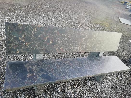 Solid benk i breksje. Storleik 200x40x12 cm. Total med understell er høgda 45 cm.