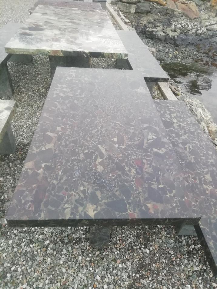Utebord med 2 benkar. Bordplata av konglomerat er 200x98x6 cm. Understell 2 stk. breksje. Høgde 72 cm.